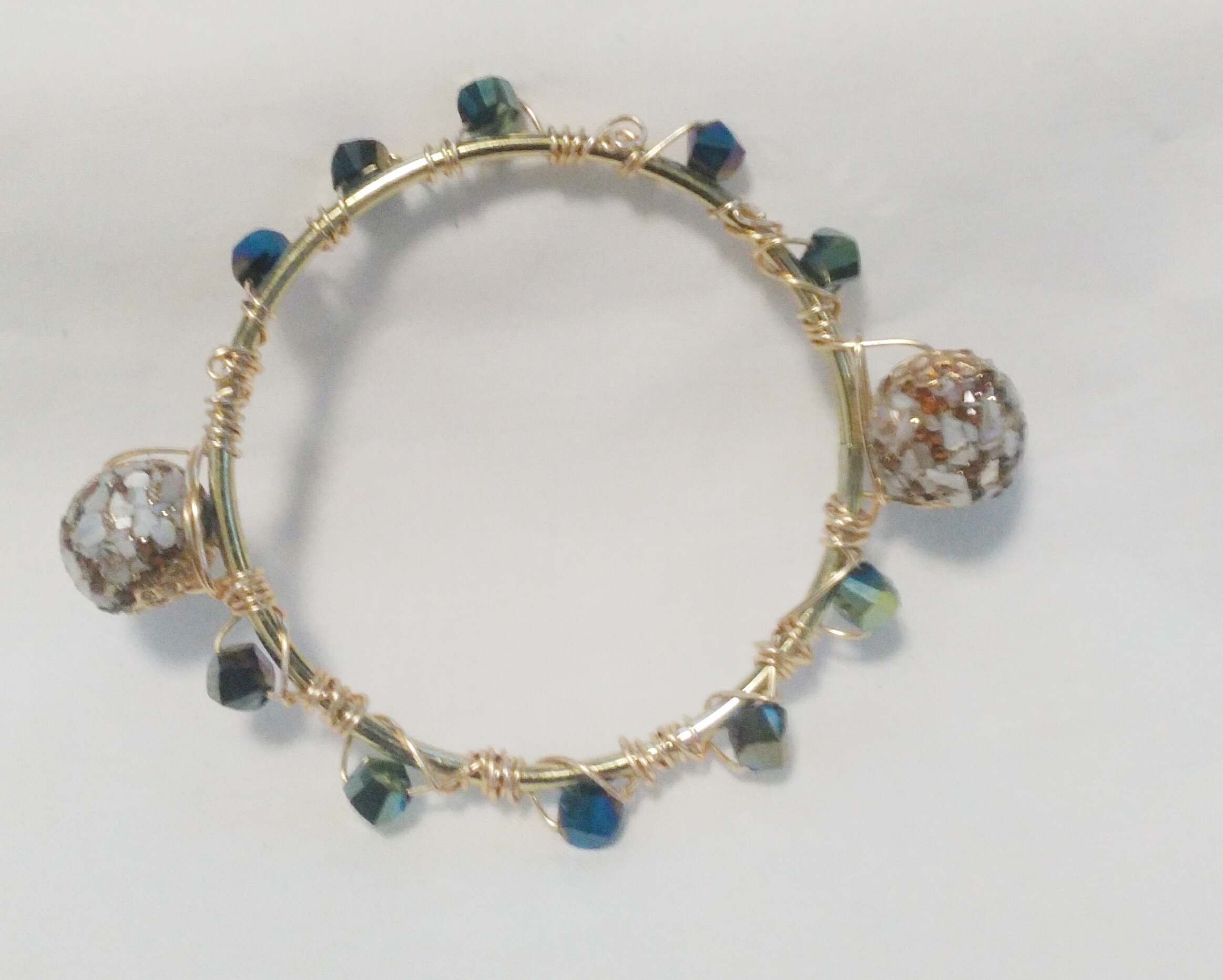 This hand-crafted 3 inch bangle features unique beading wrapped with gold plated copper wire for an elegant finish. This will definitely be excite the eye.