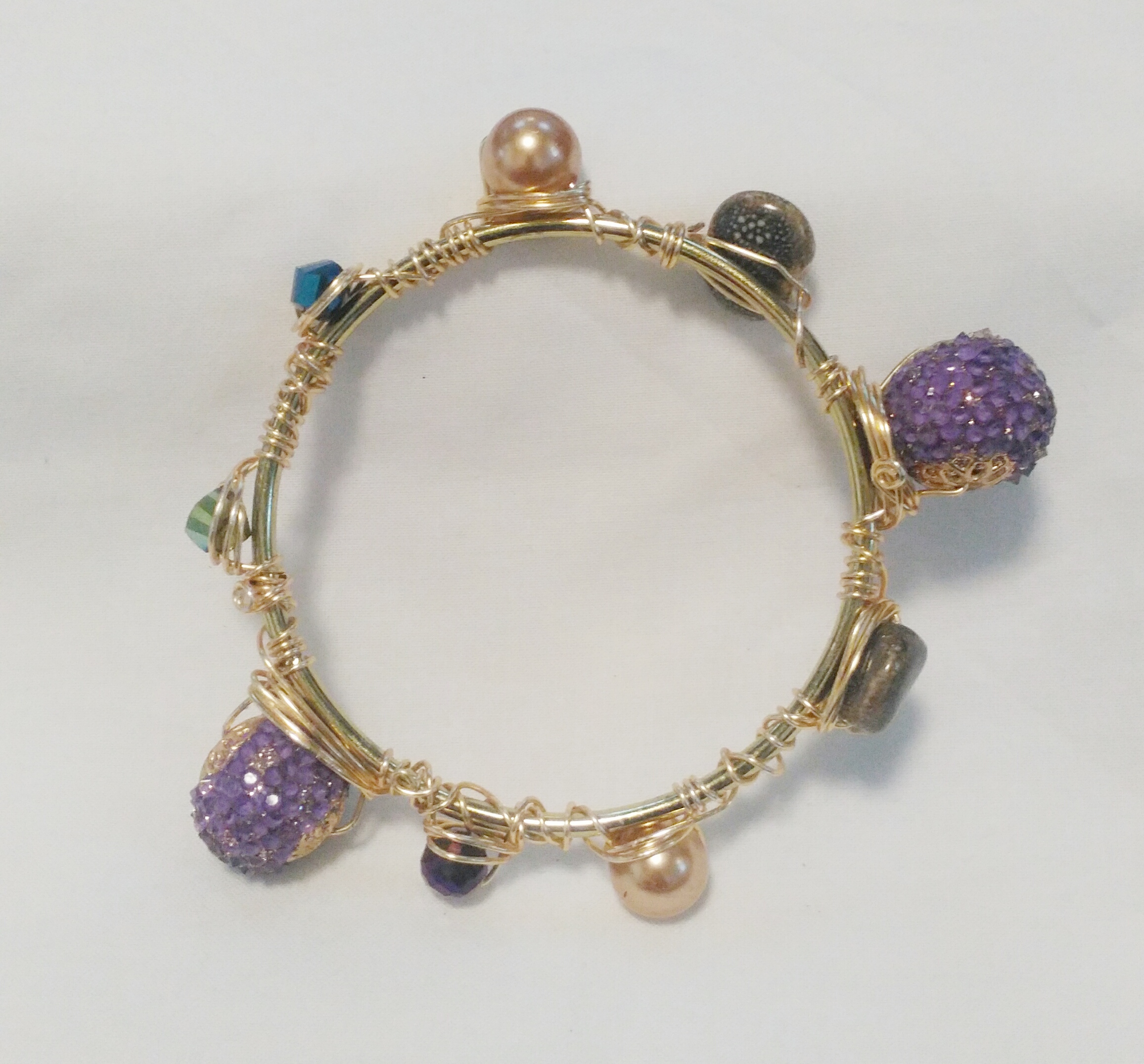 This hand-crafted 3 inch bangle features unique beading wrapped with gold plated copper wire for an elegant finish. This will definitely be excite the eye.